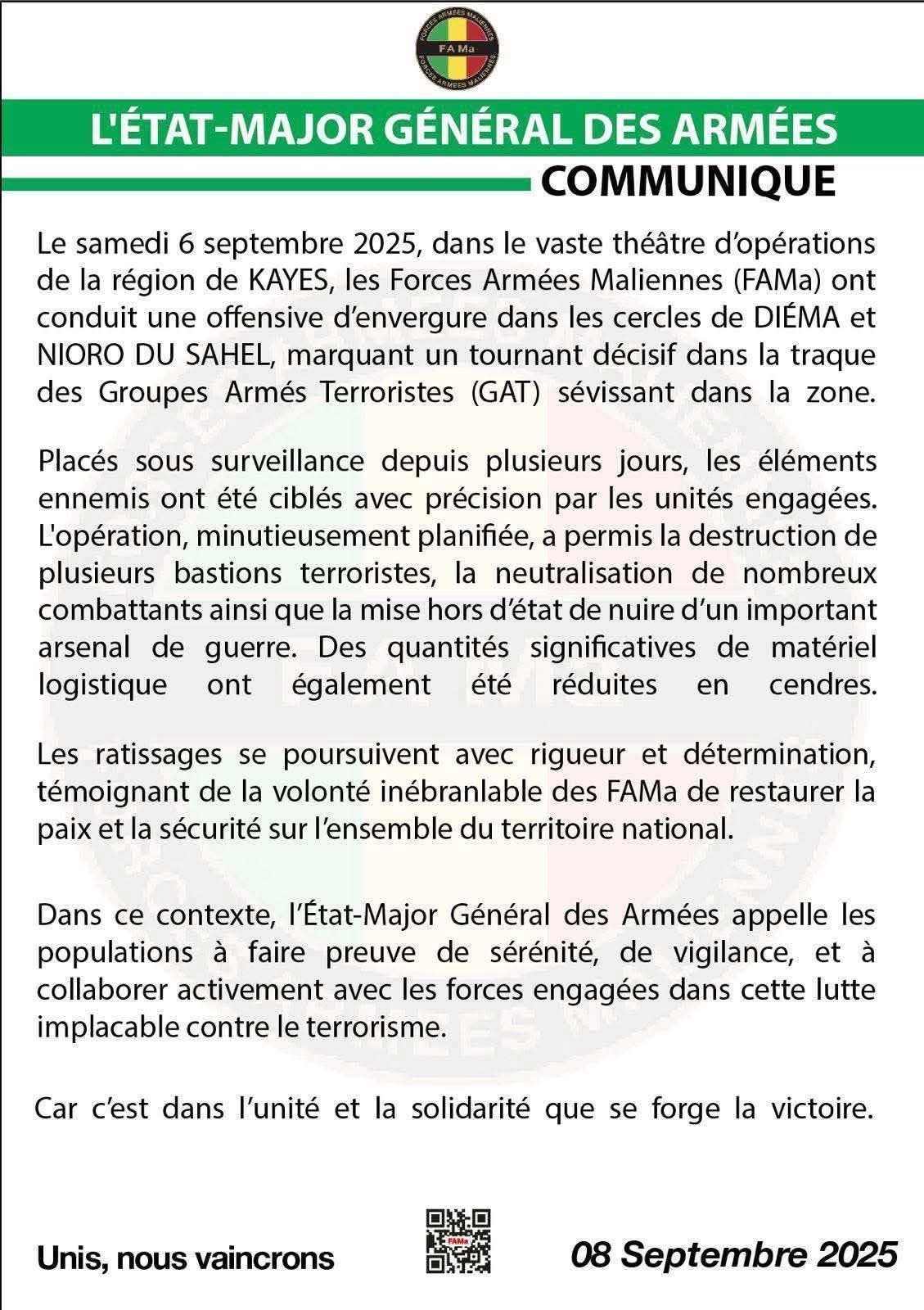 الجيش المالي يصدر بيانا حول عملياته ضد الجماعات المسلحة في عدة ولايات