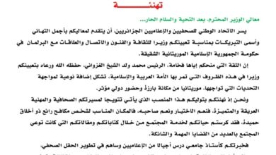 الاتحاد الوطني للصحفيين والإعلاميين الجزائريين يشيد بتعيين ولد مدو وزيرا للثقافة والفنون والاتصال والعلاقات مع البرلمان