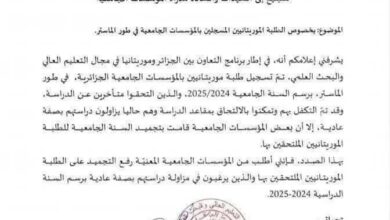 رفع التجميد عن قبول الطلبة الموريتانيين في الجامعات الجزائرية