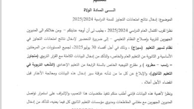 وزارة التربية تطالب المصالح الجهوية بإدخال النتائج النهائية للعام الدراسي 2024/2025 في نظام سراج قبل 30يوليو2025
