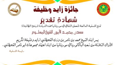 جائزة زائد و خليفة أبني محمد بن ناصر وزن القحطاني للناجحين فى الباكالوريا فى موريتانيا