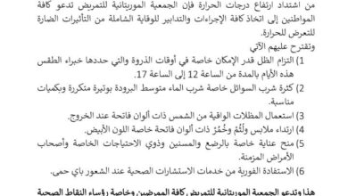 الجمعية الموريتانية للتمريض تحذر من الحرارة و التعرض لأشعة الشمس/ تعميم
