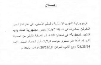 الشوؤن الاسلامية تحدد موعد التصفية الأولى من مسابقة حفظ وفهم المتون المحظرية