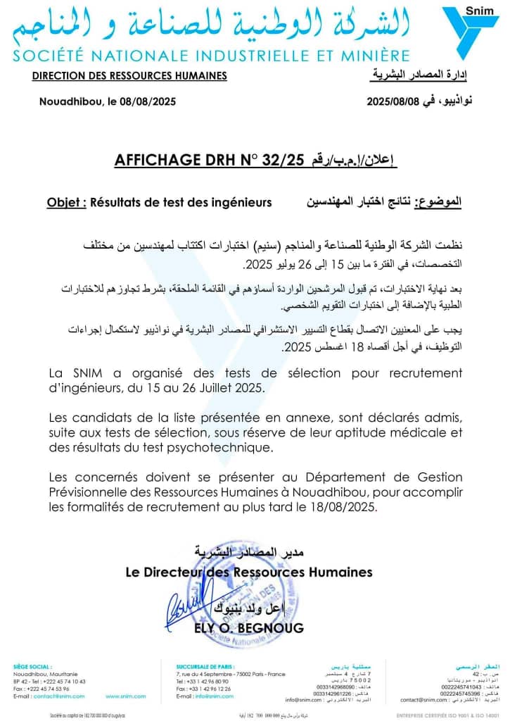 “سنيم” تعلن النتائج النهائية لمسابقة المهندسين
