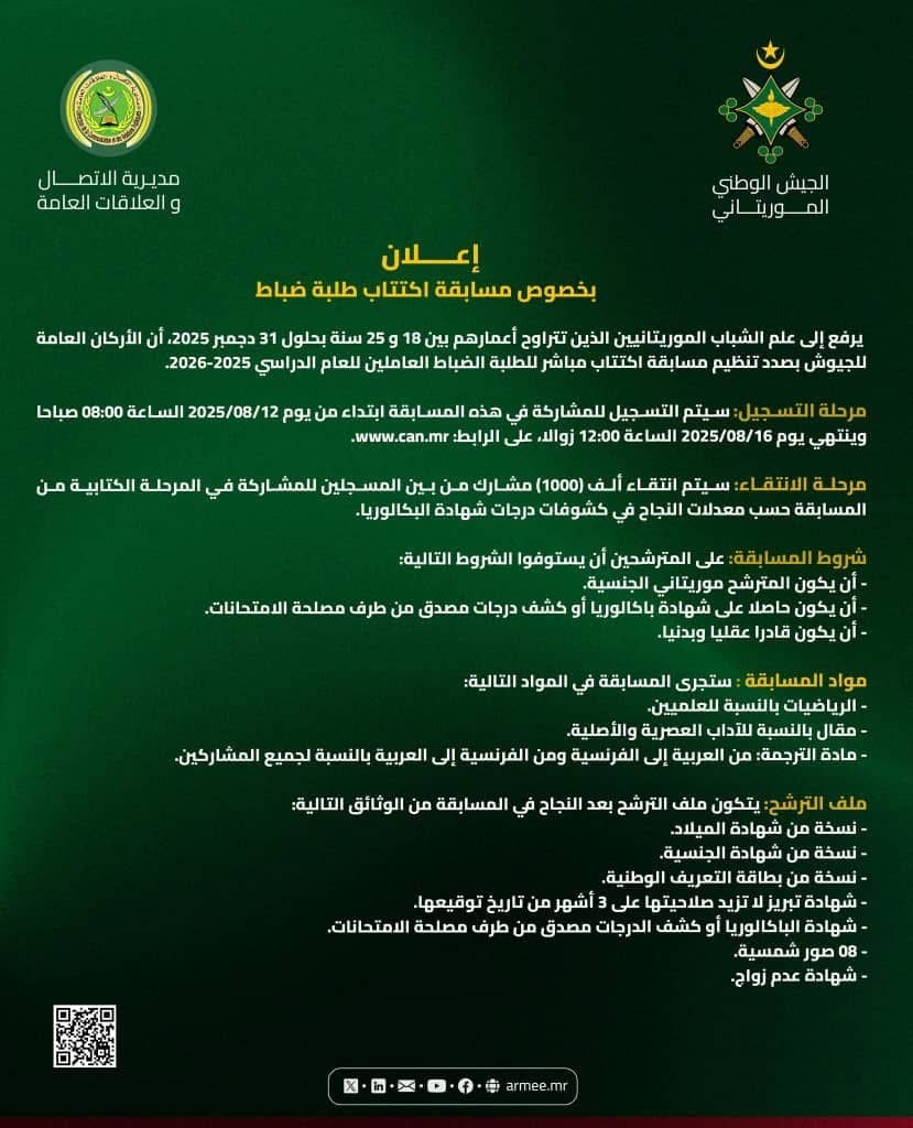الجيش الموريتاني يعلن عن مسابقة للاكتتاب