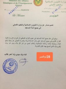 طالب وزير الشؤون الاسلامية حميغ أيمة المساجد على عموم التراب الوطنى بتلاوة القرءان على مدار الساعة تضرعا للمولى عز و جل لرفغ البلاء عن المسلمين
