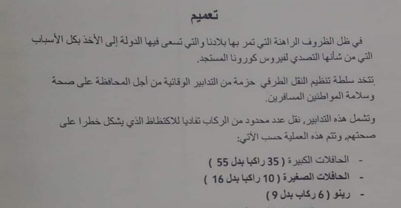 أعلنت سلطة تنظيم النقل الطريقي إجراءات جديدة تفاديا للاكتظاظ داخل الباصات وسيارات النقل العمومي.