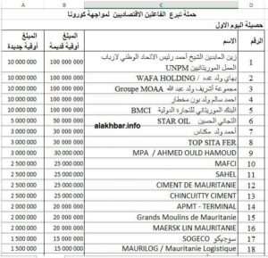 وأظهرت وثيقة حصلت عليها « تلماس انفو » أن التبرعات خلال اليوم الأول أسفرت عن جمع 924 مليون أوقية قديمة، من خلال 33 متبرعاً.