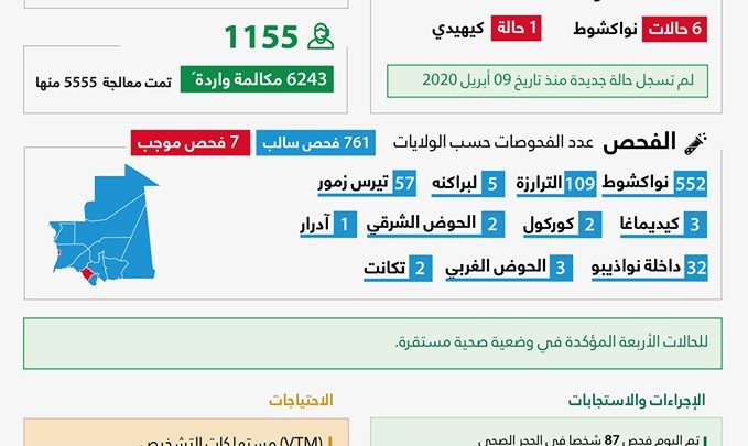 وتواصل فرق وزارة الصحة فحص الموجودين في الحجر الصحي بالبلاد، وأجرت اللجنة إلى الآن 768 فحصا، كانت 761 منها سالبة، و7 موجبة.