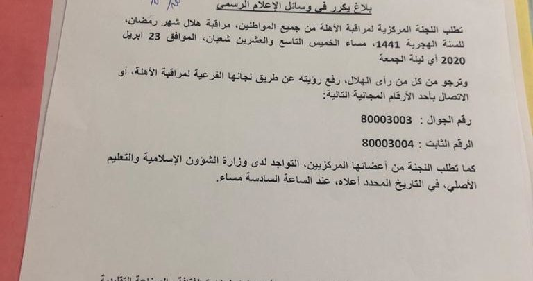 وزارة الشؤون الاسلامية تحدد “ليلة اتراعى”لشهر رمضان 1441 وثيقة