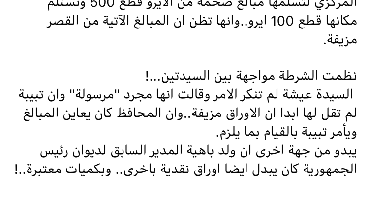 السيدة عيشة لم تنكر الامر وقالت انها مجرد “مرسولة” وان تبيبة لم تقل لها ابدا ان الاوراق مزيفة..وان المحافظ كان يعاين المبالغ ويأمر تبيبة بالقيام بما يلزم.