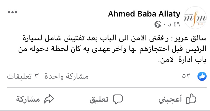 قال مدير إذاعة موريتانيد أحمد باب أعلاتي في تدوينة له مساء اليوم على صفحته على الفيسبوك ان سائق الرئيس السابق محمد ولد عبد العزيز كشف تفاصيل لحظة دخول عزيز لباب إدارة الأمن، وهذا نص التدوينة: