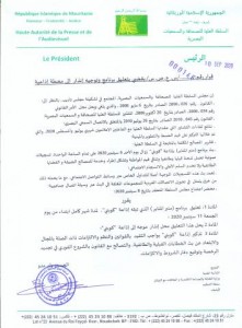 كما أصدر المجلس قرارا يقضي بتوجيه إنذار لموقع “كريدم” الالكتروني و إلزامه بالحذف الفوري لتعليق وصورة للرئيس السابق محمد ولد عبد العزيز ، نشرهما الموقع على واجهته واعتبرهما المجلس “تشهيرا بحق الأفراد واعتداء على حقوقهم المحمية بالقانون”.