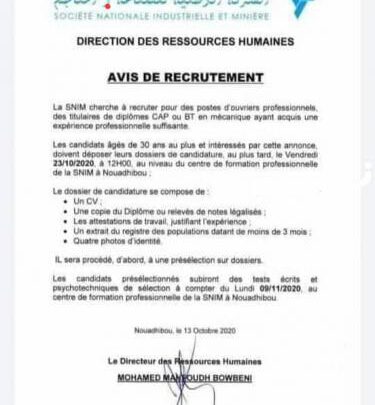 ويبدء دفع ملفات الراغبين في الترشح لغاية يوم الجمعة الموافق 23\10\2020 عند الساعة 12h00 ظهرا في مركز التكوين المهني للشركة في مدينة انواذيبو .