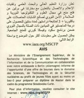 أعلنت وزاوة التعليم والبحث العلمي عن فتح الباب لمنح دراسية في مجال العلوم والتكنولوجيا النووية والسلامة والأمن النووي لصالح السيدات.