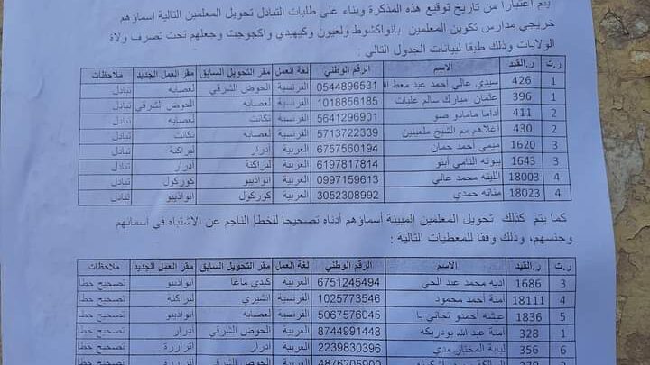 مذكرة عمل لبعض موظفي وزارة التهذيب الوطني /”التبادل”….وثيقة