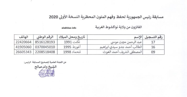 الإعلان عن الفائزين في مسابقة الرئيس لحفظ المتون المحظرية/ أسماء
