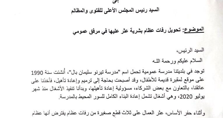 أوقفت بلدية السبخة أشغال ترميم مدرسة تيرنو سليمان بال إثر العثور على رفات عظام بشرية، ووجهت رسالة إلى المجلس الأعلى للفتوى والمظالم لمعرفة «الإجراءات الشرعية اللازم اتباعها لنقل الرفات المذكور وما قد يكشف منه لاحقا».