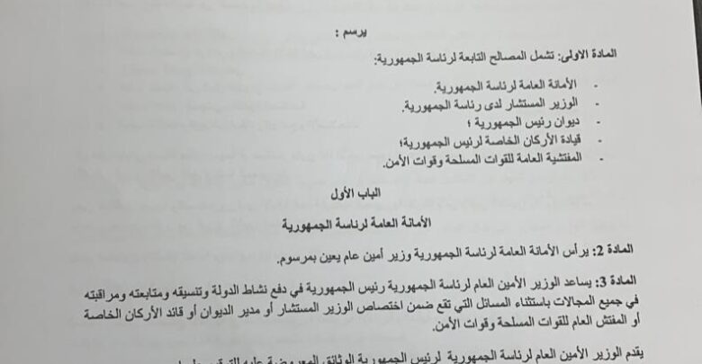 وتناول الباب الأول من المرسوم الأمانة العامة للرئاسة وصلاحياتها.