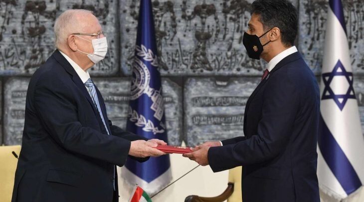 قدم سفير الإمارات الأول في دولة الاحتلال محمد محمود آل خاجة أوراق اعتماده لرئيسها رؤوفين ريفلين في القدس المحتلة.