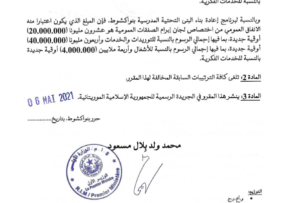 ويضيف: «بالنسبة لبرنامج إعادة بناء البنى التحتية المدرسية بنواكشوط، فإن المبلغ الذي يكون اعتبارا منه الإنفاق العمومي من اختصاص لجان إبرام الصفقات العمومية هو عشرون مليون (20.000.000) أوقية جديدة، بما فيها إجمالي الرسوم بالنسبة للتوريدات والخدمات، وأربعون مليون (40.000.000) أوقية جديدة، بما فيها إجمالي الرسوم بالنسبة للأشغال، وأربعة ملايين (4.000.000) أوقية جديدة بالنسبة للخدمات الفكرية.