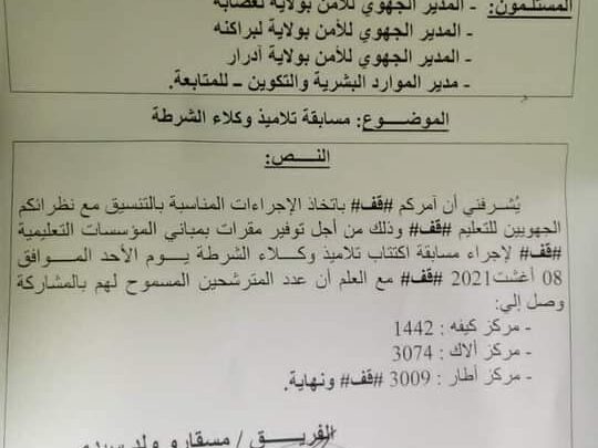 تم رسميا تحديد تاريخ 08 أغسطس المقبة كموعد لإجراء مسابقة مسابقة الاكتتاب في سلك الشرطة في مراكز ألاك، أطار، وكيفه.