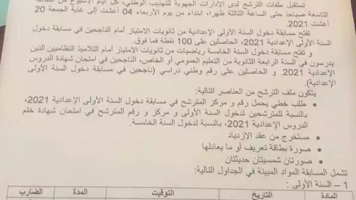 حددت وزارة التهذيب الوطني موعد إجراء مسابقة دخول إعداديات وثانويات الامتياز بجميع عواصم الولايات.