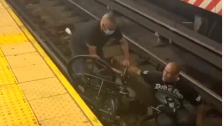 انتشر مقطع فيديو عبر منصات التواصل الاجتماعي لرجل ينقذ شخصا من ذوي الاحتياجات الخاصة سقط مع كرسيه المتحرك داخل سكة قطار في ولاية نيويورك بأميركا.
