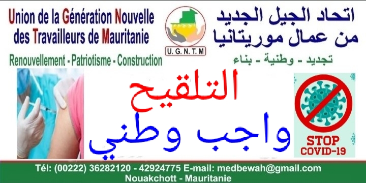 اتحاد الجيل الجديد من عمال موريتانيا UGNTM يطالب العمال بالتوجه لمراكز التلقيح ضد فيروس كورونا