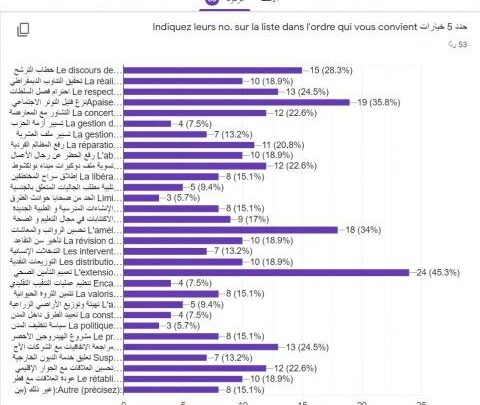 أما المرتبة الخامسة فكانت مناصفة بين : خيار فصل السلطات وخيار مراجعة الإتفاقيات مع الشركات الأجنبية .