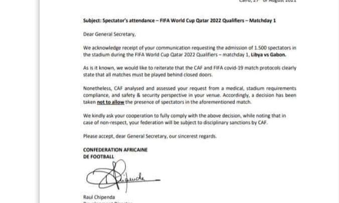 الكاف يوجه رسالة للإتحادات الإفريقية لكرة القدم يوصي من خلالها بإجراء مباريات الجولتين الأولى و الثانية من تصفيات كأس العالم خلف أبواب موصدة.