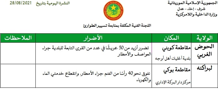 وتحدثت اللجنة في نشرتها ليوم أمس السبت، عن نفوق نحو 40 رأسا من الغنم جراء الأمطار في مركز البركة الإداري في مقاطعة بوكي بولاية لبراكنه.