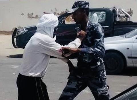 وكان ناشطون على مواقع التواصل قد تداولوا أمس مقطع فيديو يظهر شخصا وهو يعتدي على أحد أفراد أمن الطرق في الشارع