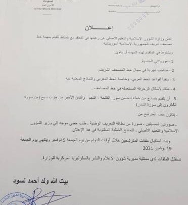 تعلن وزارة الشؤون الإسلامية والتعليم الأصلي عن رغبتها في التعاقد مع خطاط للقيام بمهمة خط مصحف شريف للجمهورية الإسلامية الموريتانية.
