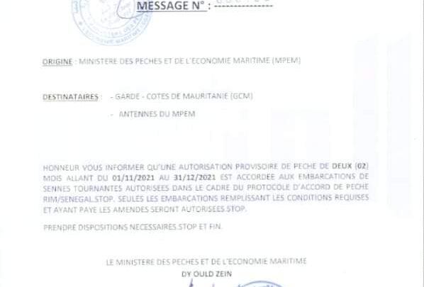 أصدر وزير الصيد والاقتصاد البحري الدي الزين مقررا يقضي بالتمديد المؤقت للزوارق السنغالية بموجب اتفاق بين موريتانيا والسنغال.