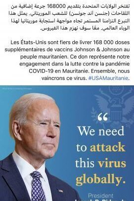عبرت سفارة الولايات المتحدة الامريكية اليوم الاحد عن ارتياحها بتقديم حكومتها 168000 جرعة من لقاحات (جونسن آند جونسن) للشعب الموريتاني.