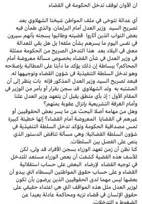 وقال إن الحكومة عليها “أن تصحح هذه الخطيئة وعلى السيد وزير العدل أن يصحح ما أفسده تصريحه من هيبة القضاء وما تسبب به من ضرر لسمعة هذا الجهاز الذي ينتظر منه الجميع العدل بينهم وإعطاء كل ذي حق حقه..”.