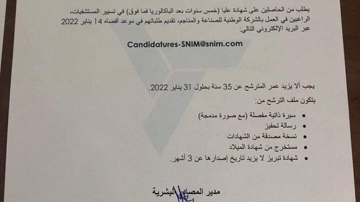 أصدرت الشركة الوطنية للصناعة والمناجم “اسنيم” إعلاني اكتتاب جديدين لصالح مجموعة من الأطر من أجل سد ثغرات في عمل الشركة.