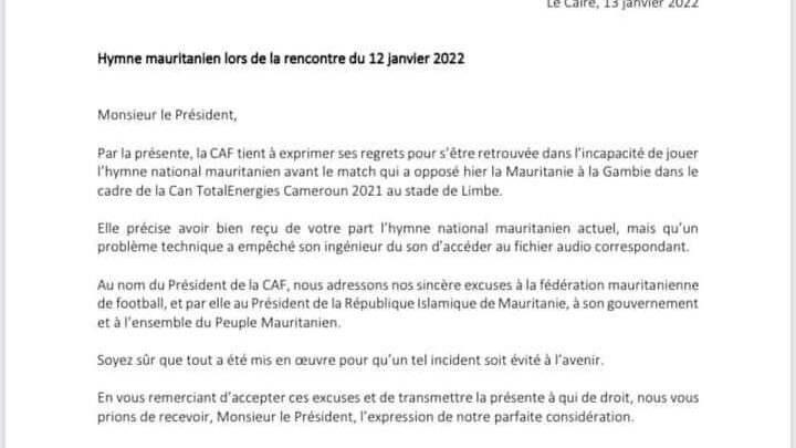 رسميا الكاف يعتذر لموريتانيا عن عدم عزف النشيد الوطني في مباراة الأمس/ وثيقة