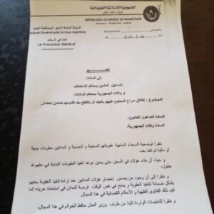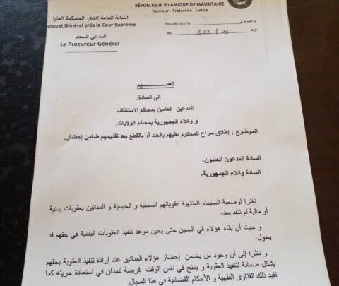 أصدر المدعي العام لدى المحكمة العليا القاضي/سيدي محمد ولد محمدالأمين تعميما الى المدعين العامين لدى دوائر الاستئناف ووكلاء الجمهورية ،يتعلق بالافراج الفوري عن جميع المحكوم عليهم بالجلد أو القطع شريطة تقديمهم ضامن إحضار الى حين تنفيذ العقوبة في حقهم.