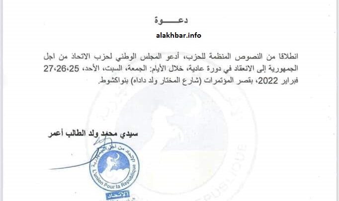 وجه رئيس حزب الاتحاد من أجل الجمهورية سيدي محمد الطالب أعمر دعوة لأعضاء المجلس الوطني للحزب لحضور دورة عادية للمجلس أيام 25 و26 و27 فبراير الجاري.