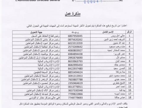 بموجب مذكرة عمل صادرة عن المدير العام لوكالة الوثائق المؤمنة ،تم تحويل الأشخاص التالية أسماؤهم إلى أماكن عمل جديدة: