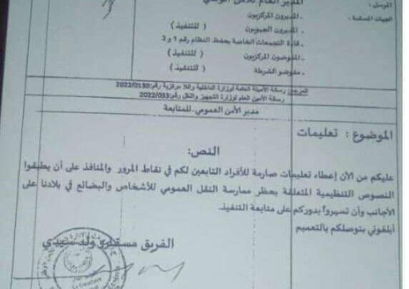 وأمر ولد سيدي المسؤولين الأمنيين الذي وجه لهم التعميم بالسهر على متابعة تنفيذه