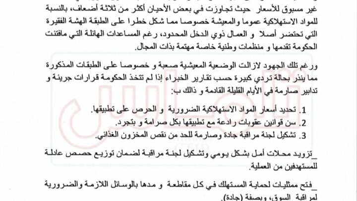 مركز تلماس للإعلام و التنمية يشخص الحالة المعيشية و يصدر بيانا حول الموضوع/ وثيقة