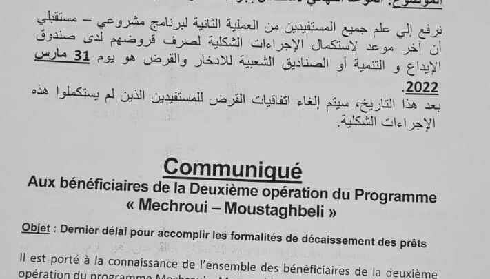 يرفع إلى علم جميع المستفدين من العملية الثانية من برنامج “مشروعي مستقبلي” أن آخر موعد لإستكمال الإجراءات الشكلية لصرف قروضهم لدى صندوق الإيداع والتنمية أو الصناديق الشعبية للادخار والقرض هو يوم 31 مارس الجاري لعام 2022.