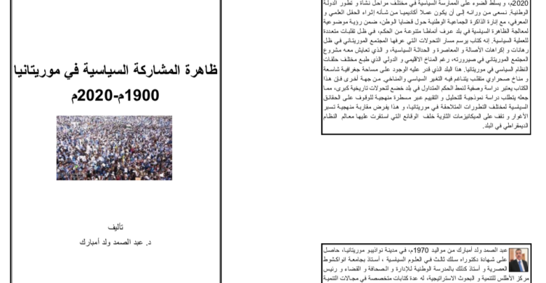 أصدر الأستاذ الجامعي والباحث الدكتور عبد الصمد ولد امبارك كتابا جديدا بعنوان «ظاهرة المشاركة السياسية في موريتانيا 1900ـ2020».