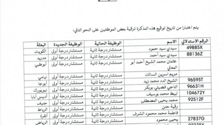 كشفت وزارة الخارجية الموريتانية، في مذكرة عمل وقعها الأمين العام أحمد سيد أحمد أج، عن ترقيات شملت 15 موظفا في السفارات والقنصليات.