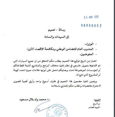 أصدر الوزير الأول محمد ولد بلال، تعميما لأعضاء الحكومة طلب فيه منهم التحقق من أن جميع السيارات التي تم اقتناؤها بتمويل خارجي في إطار تنفيذ مختلف البرامج والمشاريع تحمل على أبوابها علامات مميزة تحدد الهيئة أو المشروع الذي تتبع له.