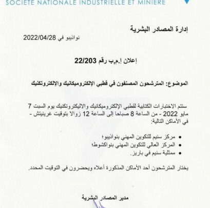 أعلنت الشركة الوطنية للصناعة والمناجم عن تصنيف المترشحين الاكتتاب المعلن عنه مؤخرا، إلى قطبين أحدهما للإلكترو ميكانيكا والآخر للإلكترو تكنيك.