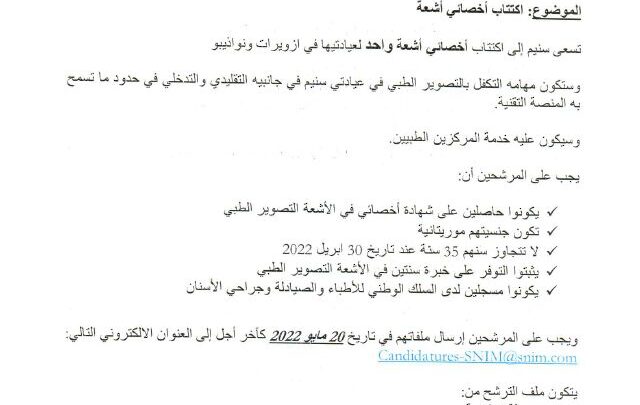 أعلنت الشركة الوطنية للصناعة والمناجم SNIM عن الحاجة إلى اكتتاب أطباء أخصائيين في مجالات متعددة، على أن تستقبل ملفات الترشح في 20 مايو الجاري كآخر أجل.